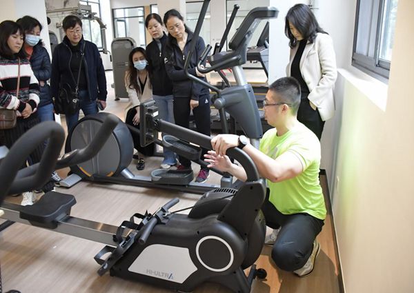 培训开始,曾教练首先向各位教职工提出了锻炼时的着装问题,毕竟安全永远要放在第一位。接着就来到了本次培训的主要环节——健身器械的介绍及使用,整个健身中心主要分为有氧区域和固定器械无氧区域。曾教练从有氧区开始,依次给在场的各位老师们介绍了跑步机、椭圆机、划船机等健身器械的正确使用方法及注意事项。