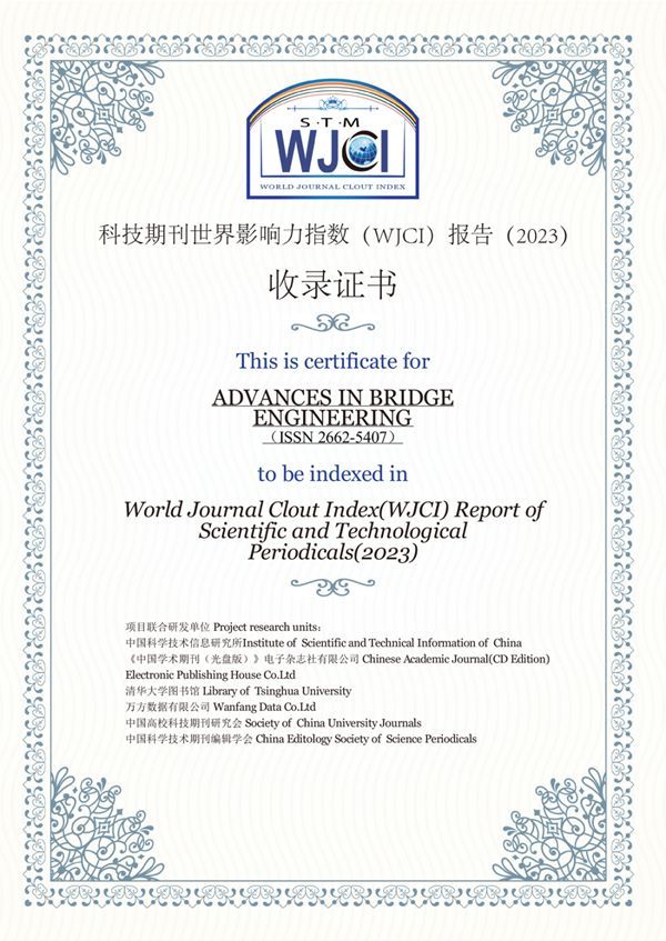 由中国科协牵头,中国科学技术信息研究所、《中国学术期刊(光盘版)》电子杂志社、清华大学图书馆、万方数据有限公司、中国高校科技期刊研究会、中国科学技术期刊编辑学会联合发布了《科技期刊世界影响力指数(WJCI)报告》2023年版。我刊Advances in Bridge Engineering被WJCI收录,影响因子2.292,在全球164本土木工程领域期刊中排名第59位,位于Q2分区。