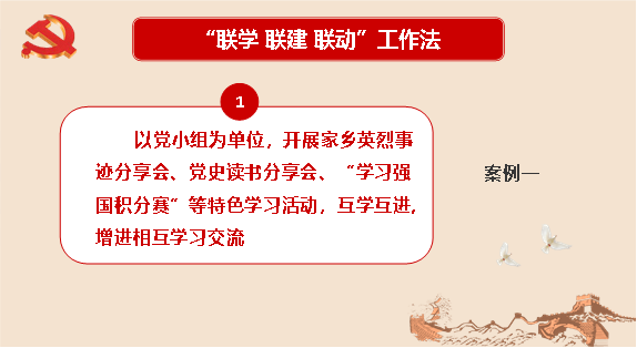 紧接着列举对应案例予以佐证,理论联系实际,力求将其他高校支部的成功经验同我支部的特点相结合,不断完善,发扬。