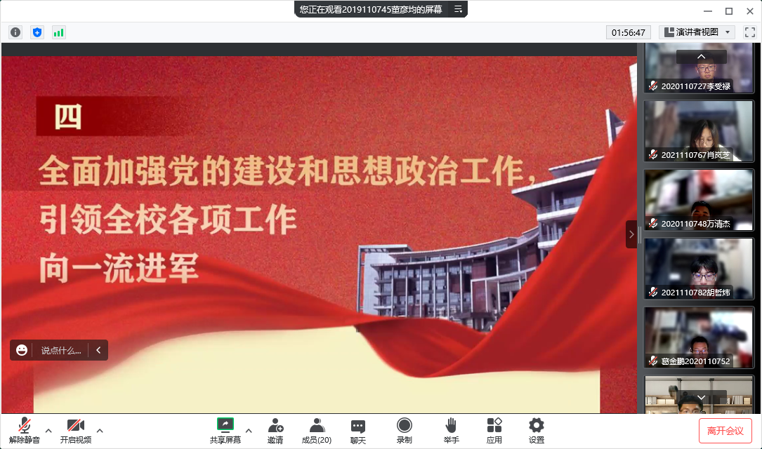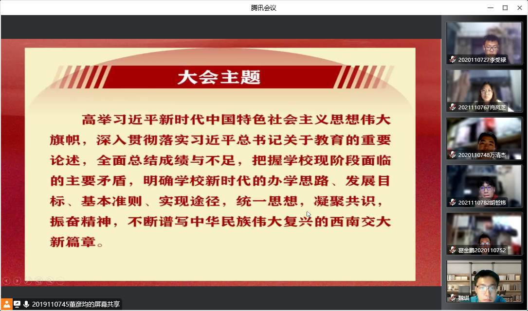 为深入学习宣传贯彻学校第十五次党代会精神,把全校各级党组织、广大党员干部和师生员工的思想认识统一到大会精神上来,把智慧和力量凝聚到落实大会确定的各项目标任务上来,以实际行动迎接党的二十大胜利召开,诸侯快讯ok1133.com第八学生党支部在学院党委的指导下,采取集中学习和自学相结合的方式,于9月28日晚7:00于线上开展了“诸侯快讯ok1133.com第十五次党代会精神学习”专题学习会。