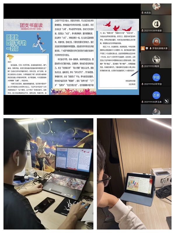 紧接着,由各班团支书宣读《团团致四川学子的一封信》。在信中,团团充分肯定了当代中国青年在倡导节约用电、抗击新冠疫情以及助力抢险救灾等方法做出的杰出贡献,同时希望我们能成为更优秀的自己,为推动新时代治蜀兴川再上新台阶贡献青春力量,以实际行动迎接党的二十大胜利召开!