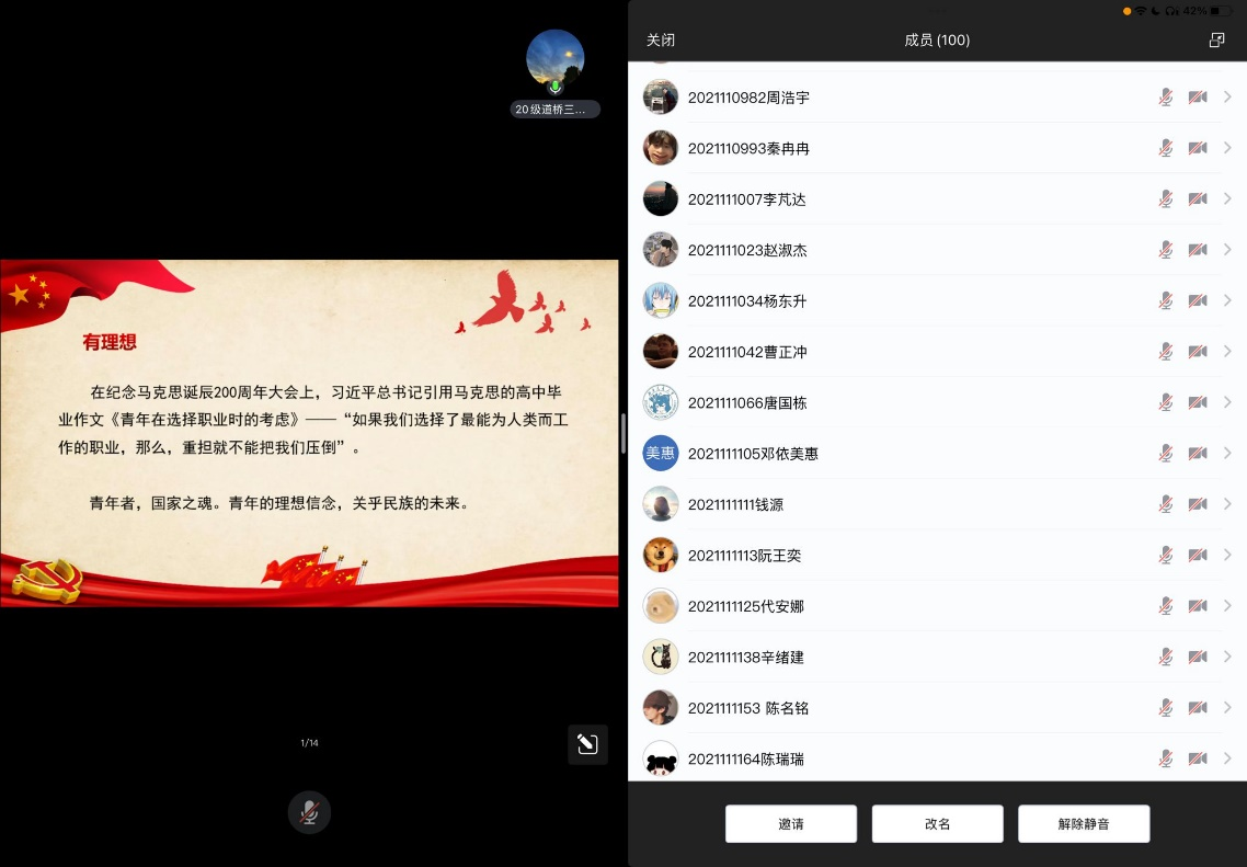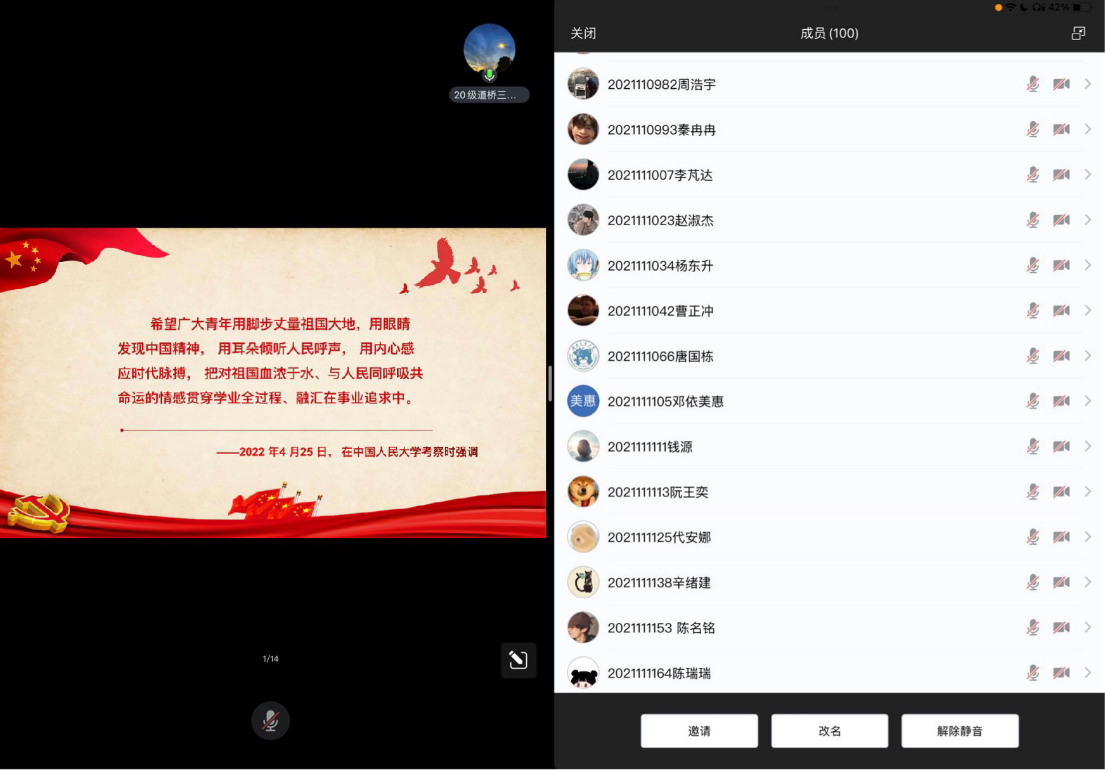 2023年6月14日晚,土木学生造价、城地、道桥党支部共同组织展开了“习近平总书记与大学生在一起”主题党日活动,本次活动采用线上腾讯会议的形式进行。会议由城地党支部书记李泽超同志主持,由道桥党支部宣传委员王澄宇进行讲解分享,三个支部全体党员参加了会议。