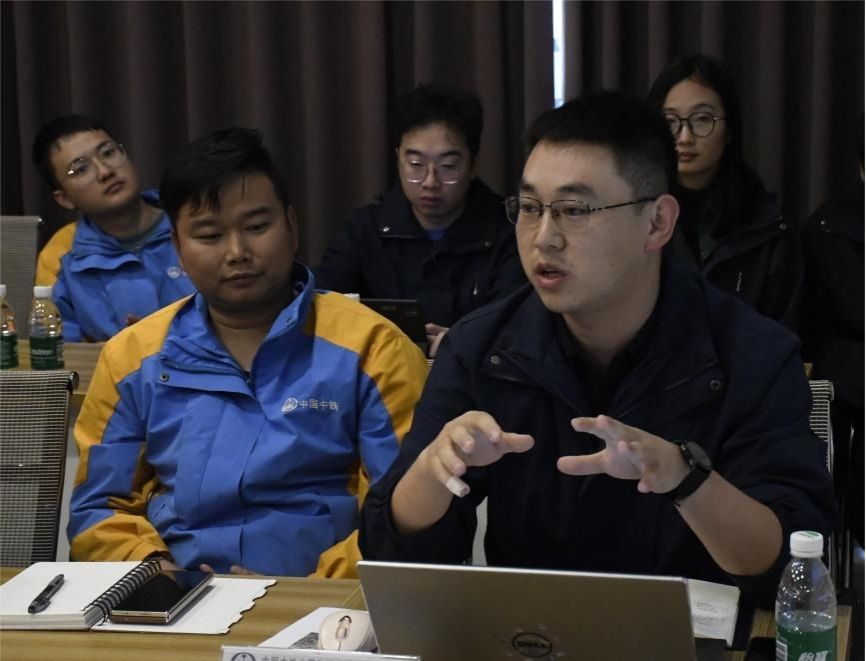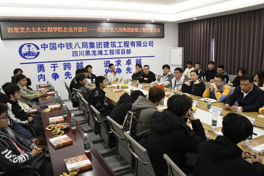实操教学结束后,学院师生前往中铁八局建筑公司黑龙滩项目驻地进行校企座谈交流。本次座谈会由中铁八局建筑公司人力资源部部长张丹主持。张丹部长表示,此次主题党日活动暨企业开放日活动在于让同学们通过参观交流真正的了解企业、感受企业氛围,希望通过此次活动,同学们能够对施工单位企业有全新的认识,打破信息壁垒,更好的规划个人未来发展。