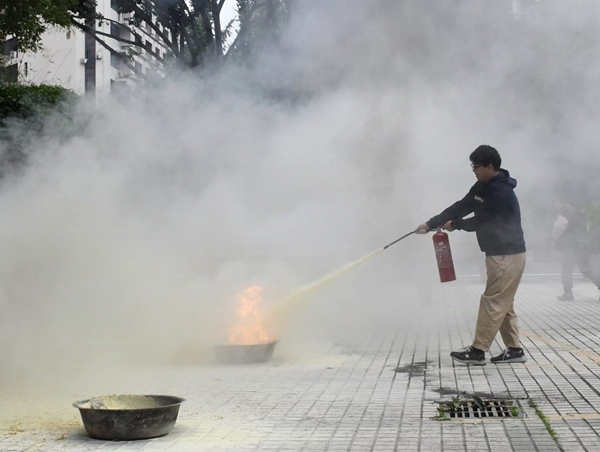 最后,李主任带领大家在学校大会堂门口空地进行了实地模拟演练,通过介绍灭火器的分类及相关灭火演示,同学们更加直观地了解实了灭火器的使用,掌握了更多的灭火和应急处理技能。