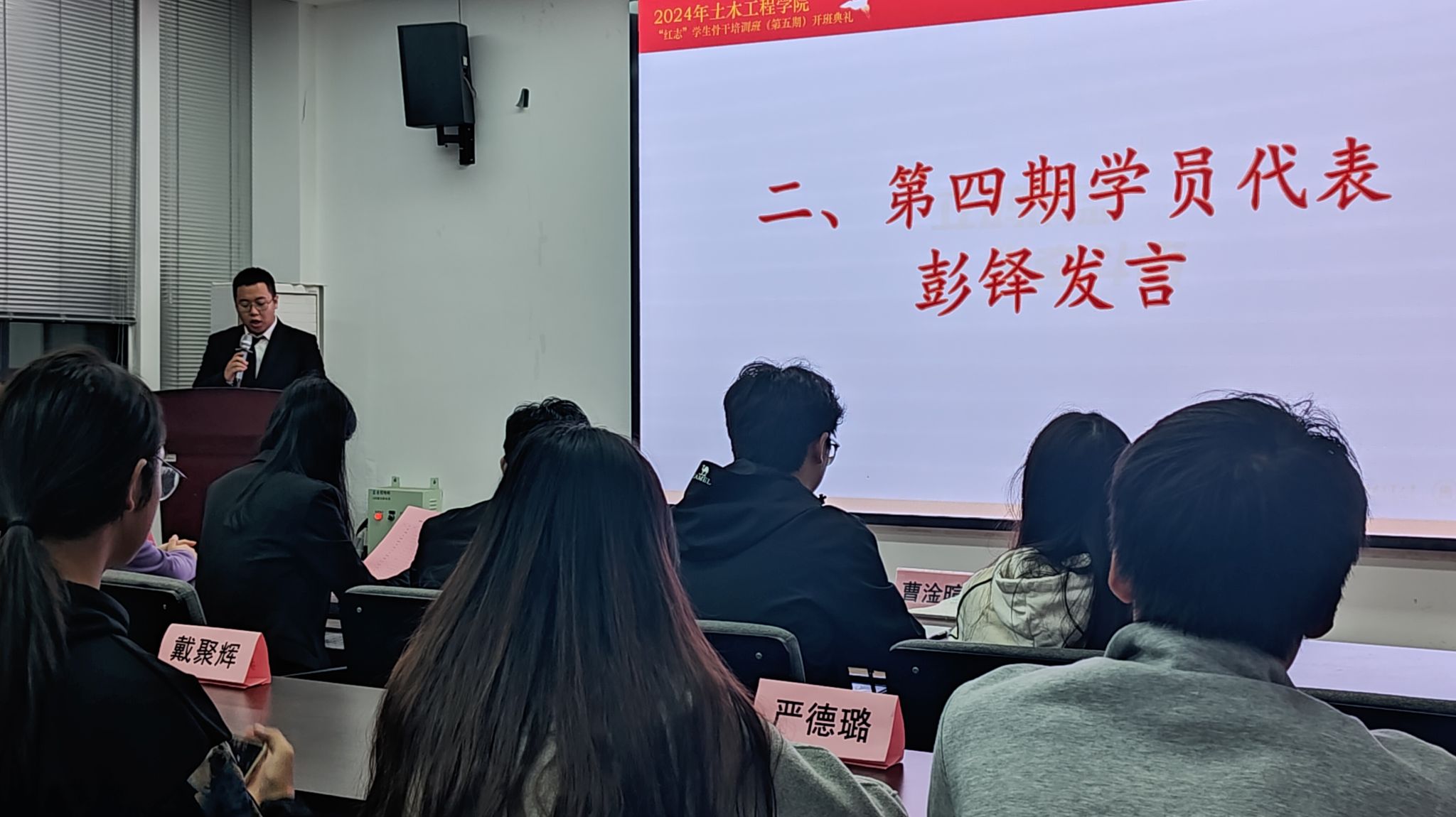 随后,“红志”班第四期学员代表彭铎同学上台发言。彭铎向同学们分享了自己在“红志”班的学习经验和心得体会,鼓励同学们勇立鸿鹄志,在第五期“红志”班中认真学习,提升自我。