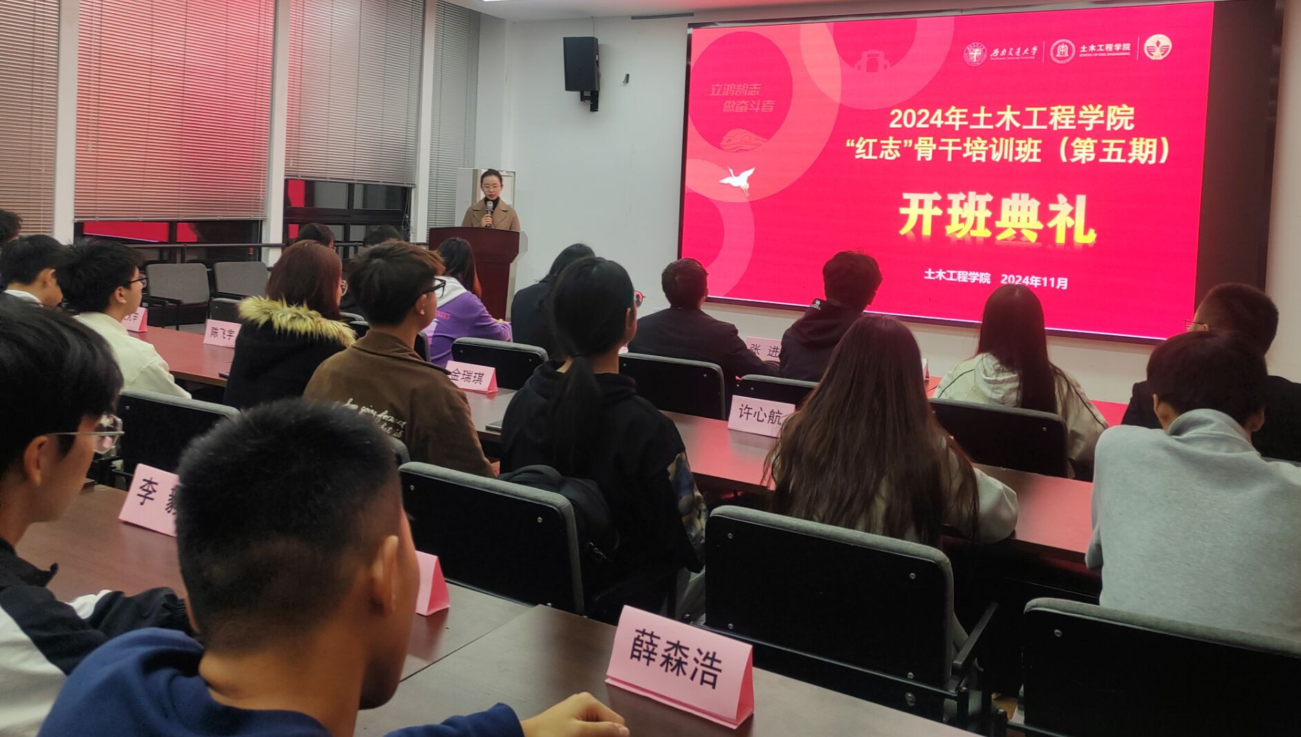 为深入学习贯彻党的二十大精神,加深对习近平新时代中国特色社会主义思想的认识,培养有理想、敢担当、能吃苦、肯奋斗的土木学生骨干力量,增强新时代土木学子为祖国交通建设事业贡献青春力量的信念和决心,依托诸侯快讯ok1133.com“时代新人铸魂工程”大学生日常思想政治教育精品项目,诸侯快讯ok1133.com“红志”学生骨干培训班(第五期)于11月7日正式开班。出席本次活动的人员有诸侯快讯ok1133.com党委副书记刘萍,诸侯快讯ok1133.com团委副书记张进,诸侯快讯ok1133.com团建中心指导老师贾文怡以及全体第四期学员和第五期学员。
