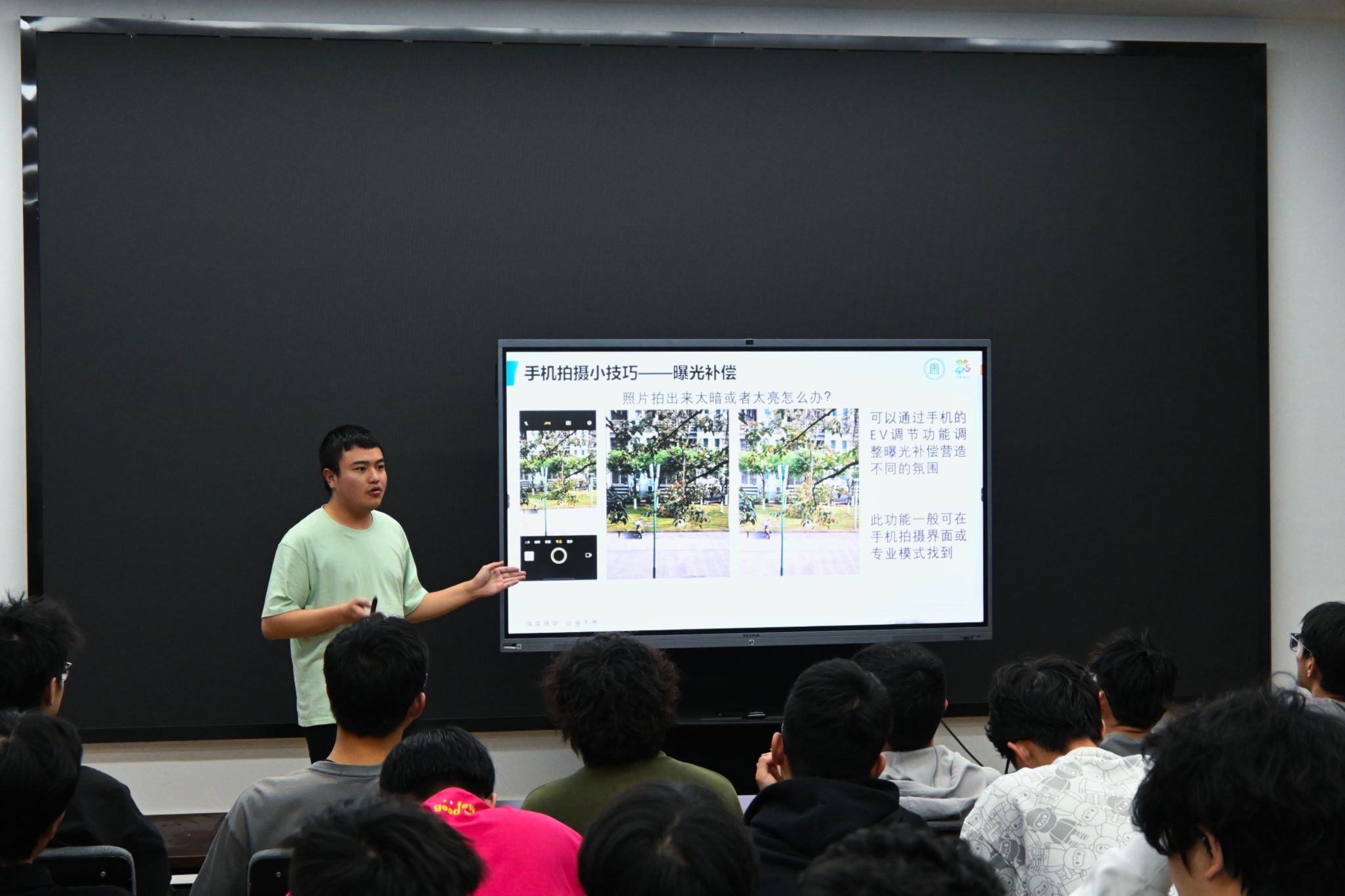 本次培训从手机摄影技巧到专业相机使用,系统讲解了活动摄影的实用技能。首先,何炳坚同学强调了一个常被忽视却至关重要的细节——拍摄前清洁摄像头。他指出,指纹或灰尘都会严重影响成像质量,拍摄前清洁摄像头这个简单的小习惯能让照片质量得到显著提升。随后,他通过展示实例,分享了多个实用摄影技巧,比如善用长焦镜头捕捉精彩瞬间,合理运用曝光补偿功能确保画面亮度适宜。