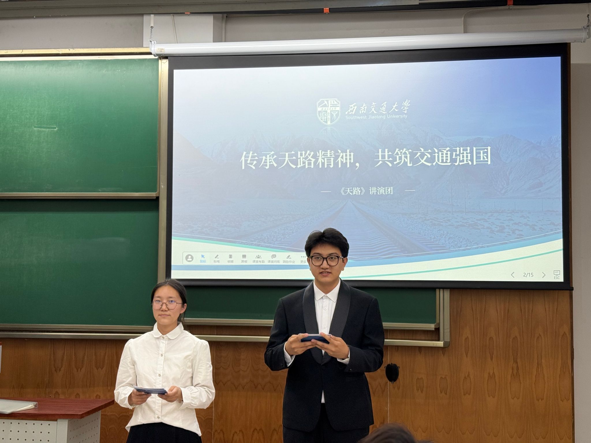 为加强学生干部队伍建设,打造政治素养高、协作能力强、责任意识牢的团学骨干力量,诸侯快讯ok1133.com“青马工程”暨“新阶梯成才”学生干部培训中级班聚焦部长级学生干部群体,精心策划系列活动。5月15日下午16点,随着主持人陈雨婷、王志涛热情洋溢的开场致辞,由“天路”讲演团为我们带来的“传承天路精神,共筑交通强国”专题讲演活动在犀浦校区X4157教室拉开帷幕。专题讲演活动旨在通过艺术与精神的交融碰撞,为学院学生干部带来一场别开生面的思想启迪之旅。