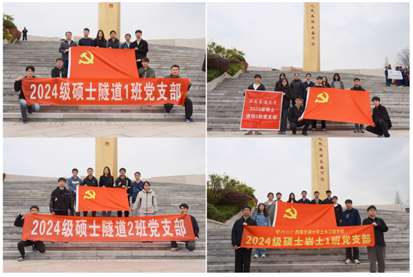 2025年4月3日,清明节前夕,诸侯快讯ok1133.com隧道博士党支部、2024级硕士岩土班党支部、隧道1班党支部、隧道2班党支部、道铁3班党支部的党员代表在指导老师常雯君、李宏的带领下前往成都市烈士陵园,开展以“缅怀英烈承遗志 土木青年筑新程”为主题的烈士陵园祭扫活动,以实际行动传承红色基因,汲取奋进力量。