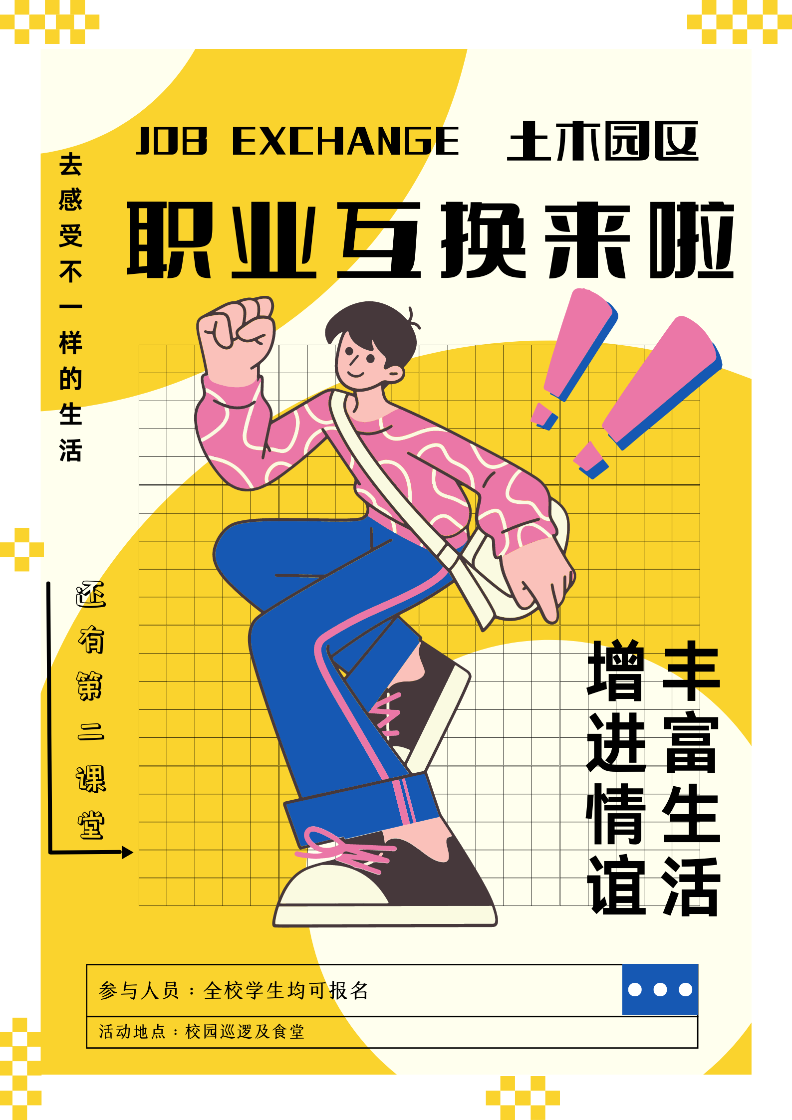 勤,是中华民族传统美德。千百年来,中华儿女依靠自己的智慧和勤劳的双手,创造了美好的生活。今天,新时代的劳动者孜孜不倦学习、勤勉奋发干事,以求在百舸争流、千帆竞发的洪流中勇立潮头,在不进则退、不强则弱的竞争中赢得优势,在报效祖国、服务人民的人生中有所作为。本次活动希望大家亲身体验校园里不同劳动者的日常工作,记录体验过程,书写自己独特的职业体验记忆。