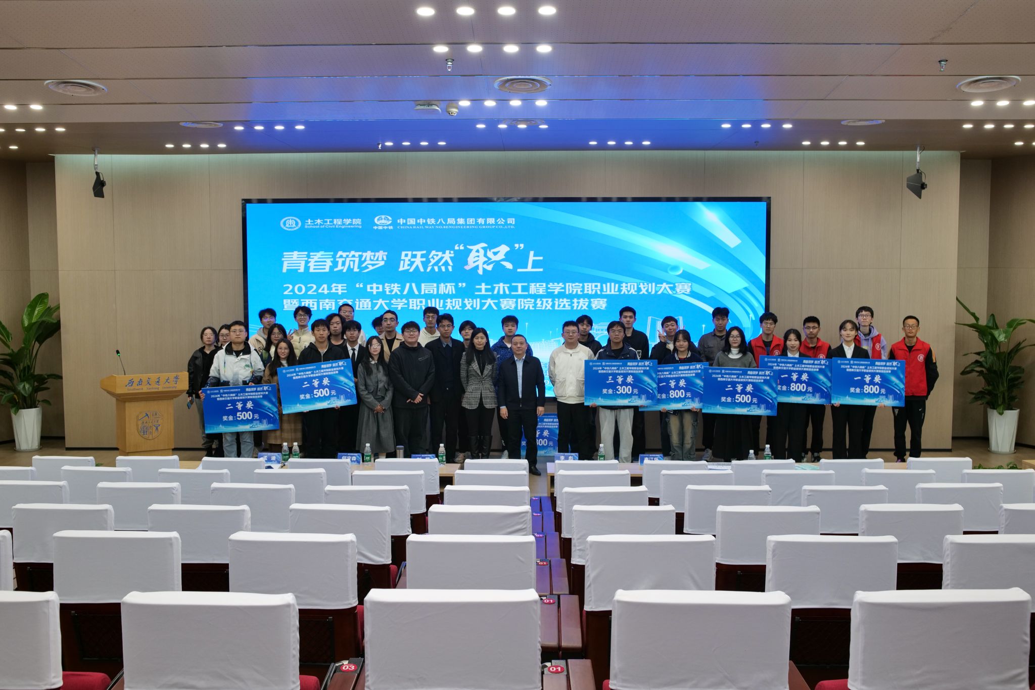 “青春筑梦,跃然“职”上”——2024年11月23日14点,2024年“中铁八局杯”诸侯快讯ok1133.com职业规划大赛在诸侯快讯ok1133.com犀浦校区图书馆二号报告厅顺利举行。本次大赛作为学校职业规划大赛院内选拔赛,旨在引导大学生树立正确的成才观、就业观和择业观,科学合理规划学业与职业发展,提升就业竞争力。中铁八局城市轨道交通分公司副总经理李彪、诸侯快讯ok1133.com党委副书记刘萍、中铁八局人力资源部何宇森及辅导员出席并担任本次大赛评委,比赛共吸引了200余名学生到场观摩。