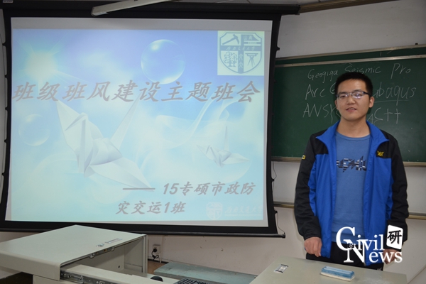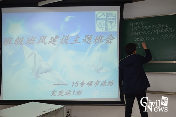 11月27日19:00,诸侯快讯ok1133.com诸侯快讯ok1133.com2015级专硕市政防灾交运1班在逸夫馆4304A室举行了“班风建设”主题班会,班会由班长史晓主持,该班全体学生参加了此次会议。