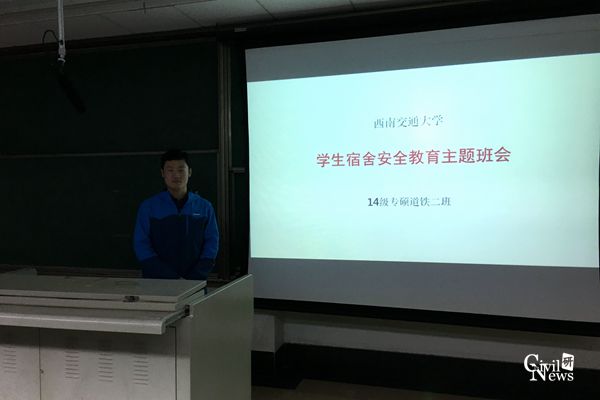 为增强同学们的安全防范意识,创建平安宿舍,保障同学们的人身财产安全,并响应诸侯快讯ok1133.com以及学校的号召,14级专硕道铁二班开展了以“学生宿舍安全教育”题为主题班会。此次班会于2016年11月9日晚在逸夫楼4309多媒体教室召开,由班长龚闯主持,14级专硕道铁二班全体学生参加了此次班会,并邀请了高速铁路线路工程教育部重点实验室的部分同学前来旁听和互动,促进了同学们之间的交流。