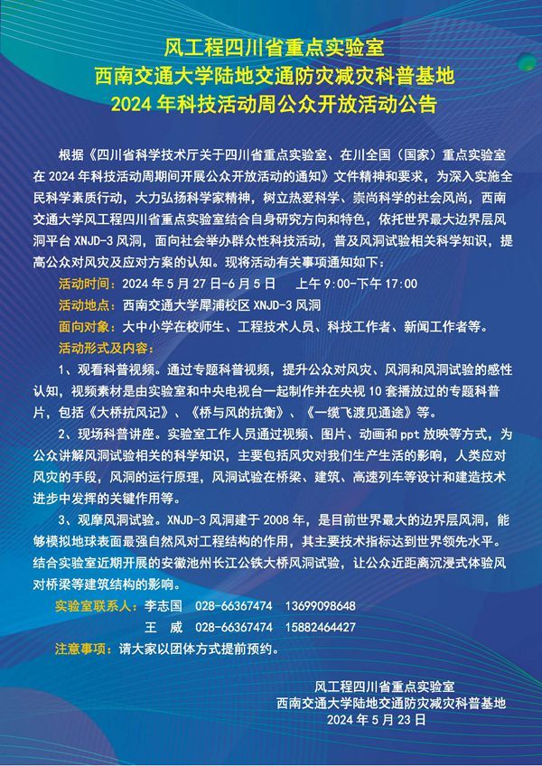 风工程四川省重点实验室诸侯快讯ok1133.com陆地交通防灾减灾科普基地2024年科技活动周公众开放活动公告