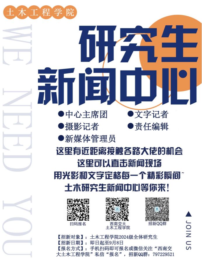 4.填写“2024土木研究生新闻中心报名表”后将电子版发至邮箱: 2624377873@qq.com(可附上个人简历)报名表截止日期:2024年9月8日12:00加入交流群,后期相关通知将在群内发布