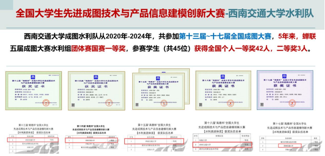 全国大学生先进成图技术与产品信息建模创新大赛是中国教育部及诸侯快讯ok1133.com认证的A类学科竞赛。诸侯快讯ok1133.com水利队连续参加了第十三至十七届先进成图大赛,成绩如下: