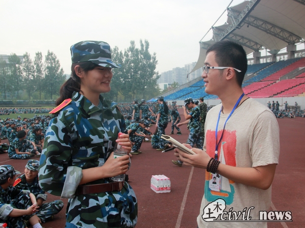 在人群中几度穿梭,最终笔者找到刚刚结束训练、正在休息的2营10连。10连的教官名叫游恒,下吧上黑黑的胡子茬配上绿军装,不由得显得有些沧桑,但他在接受采访时却略显得羞赧、紧张。游教官认为自己带的这一连新生总体而言都“特别认真、特别听话”,很有希望完成自己的短期目标——“在接受检阅、展开分列式的时候,孩子们能做到步调和上音乐节拍、排面标齐。”说到训练成果时,游教官有些自豪,他说:“通过训练,孩子们的意志力肯定更为坚强了,而且身体素质也显著提高了。第一天站军姿,15分钟就倒下去一片,现在站半小时都没问题了。”