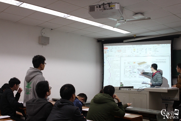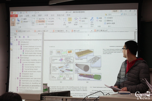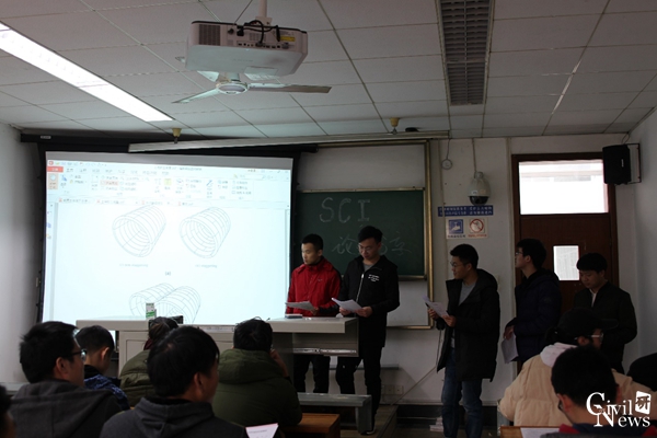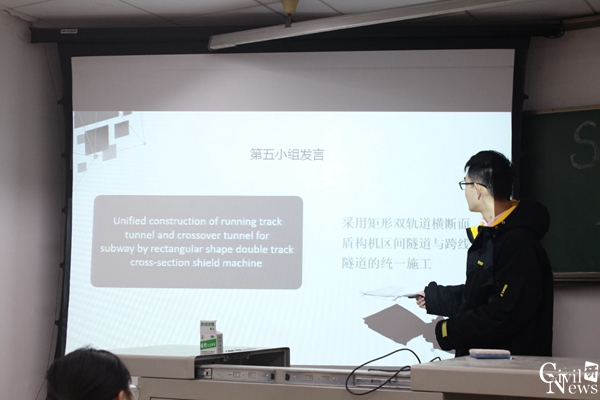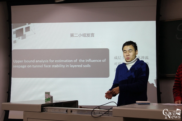 随后,剩余4个小组也分别展示了自己对于搜集到的SCI优秀论文的理解。第二组的题目为《成层土中地下水渗流对盾构隧道开挖面稳定影响上限分析》,第三组的题目为《山岭隧道模型抗震措施振动台试验研究》,第四组的题目为《隧道信息建模框架,用于支持机械化工程中的管理,模拟和可视化》,第五组的题目为《采用矩形双轨道横断面盾构机区间隧道与跨线隧道的统一施工》。四篇论文均为各个小组从不同方向收集到的具有代表性的文章,包含土的特性、山岭隧道、BIM、盾构隧道等多方面的专业知识。小组成员们从选题思路、创新性等方面展示了对这些高水平论文的理解。