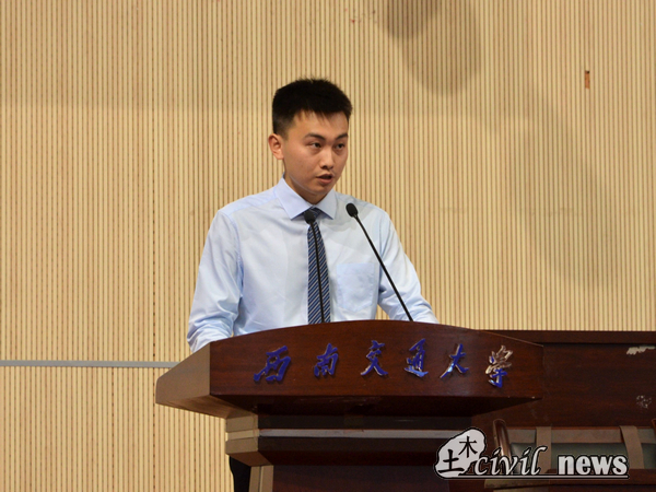 接下来大会进入第五项,由来自三班的新生代表刘明峰同学发言。他向大家诉说了自己与西南交大与土木学院的缘分:父亲是一名工程制图工作者,从小受到父亲工作的熏陶,参加学校桥梁模型比赛时与父亲的共同制作让他坚定了土木的信念,在七月志愿填报时,在成功拿到录取通知书时,这颗经历十余年积淀的种子,向着他最爱的地方,生根发芽。随后刘明峰同学向大家提出了三点倡议:第一学会自律,步入大学就是慢慢与社会接轨,面对未来的种种挑战,唯有自律从小事做起,约束自己的言行举止,制定学习计划才能让大学生活变得十分美好。第二学会主动,脱离了被迫学习的方式,而现在主动学习是最新方式。第三学会承担,诚如梁启超先生的《少年中国说》,我们已经步入成年,承己责任,不负韶华。最后刘明峰同学祝愿大家在大学生涯中都能收获成长。