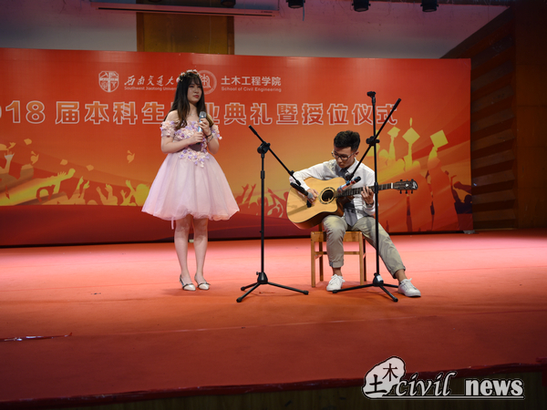 岁月静好,光阴荏苒,那些花儿始终盛开在毕业生的心底,土木1班的谭懿玲和土木12班的邓旨珩共同弹唱《那些花儿》,悠扬的歌声中,回忆激起了阵阵涟漪。
