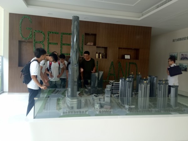 然后我们在几位学长的带领下,前往绿地中心468工程的施工现场。首先在展示厅内,观看绿地中心468工程的展示视频,了解到绿地中心468工程的具体内容和特色工艺以及技术。
