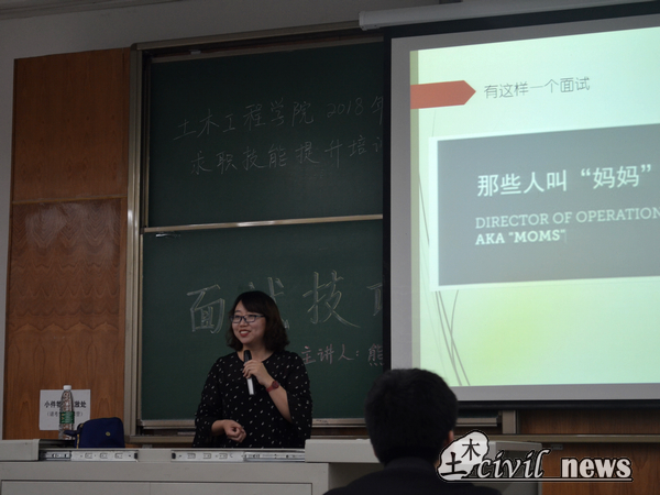她向大家介绍了面试的两大基本原则:了解自我、了解企业。了解自我也就是对自己的知识水平、综合能力以及个性特征等方面有更清晰的认识,了解企业也就是去了解行业前途,企业地位、规模以及地理位置等。只有了解自我、了解企业才能找到真正适合自己的工作。