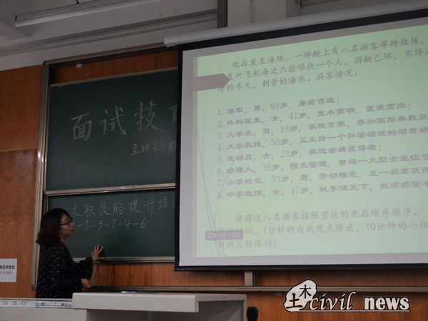 课程一开始,熊麟老师首先就面试的重要性以及面试场景的多样性展开讲解,生动的语言配合形象的图片,同学们对小组面试、群体面试等多种面试形式有了更为深刻更为全面的了解。正所谓“知己知彼,百战不殆”,熊麟老师用自己详细专业的知识重新诠释了这一道理。