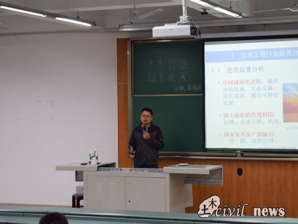 开始阶段,蒋教授说明了土木行业的总体发展趋势,并强调土木工程行业现在是朝阳行业,具有很大的发展空间,就业形势日新月著。其要点为:我国的土木工程建设逐渐向高空和地下发展,以开拓更大的生产和生活空间。作为城市发展的产物之一,高层建筑物不仅在数量上越来越多,而且在高度上也越来越多,与地面高空发展相对应,地面下基坑开挖的深度越来越大。地下空间的开发也有着巨大的吸引力。且人们将会设计出更为优化的方案进行土木工程建设,以缩短工期、提高经济效益。