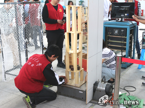 开场白后,比赛正式开始。第一个上场的组是来自大一的,一共三人,两人在搭建模型的同时,另一位队友罗源正在进行答辩。他介绍到:“我们是第一次参加这种比赛,可能有许多不足的地方。我们的想法是将质量大部分集中在模型的底部,来增加稳定性。希望通过这次比赛吸取经验,为以后参赛做准备。”搭建结束后是加载环节,选手们把模型放到加载台上,用泡沫板和胶带进行固定,有工作人员通过电子设备施加地震波。加载环节一共进行三次,第一次施加的是汶川地震时的地震波,之后每次加载,波强度都会有一定程度上的增加。当第一组选手三次加载都成功时,观众席响起了掌声。此时,李力老师点评道:“来自大一的同学能做到这种程度已经很不错了,如果能在细节方面和模型的重量方面再完善一下就更好了,希望你们再接再厉!”