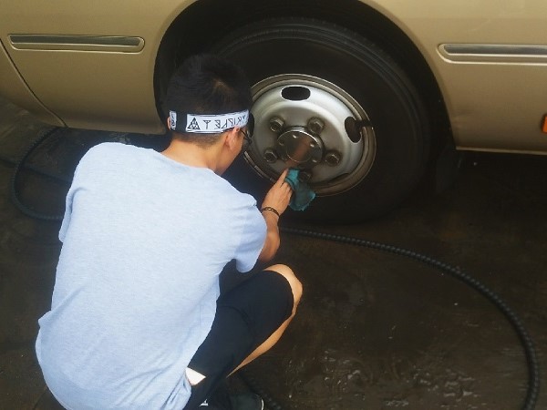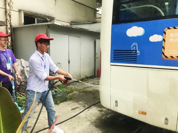 一点三十分在犀浦北区校车站集合后,坐上校车前往九里。坐车的劳累与太阳的火辣丝毫没有降低队员们的热情,队长清点完人数后分发了小红帽与工作牌,对今天的工作进行简要分工。队员们拿着自己的工具开始各司其职,先用水枪大致清洗一下,然后就用抹布与拖把开始仔细的清洗,志愿者们一点一点的擦干净了校车的每一个角落。一辆辆校车风尘仆仆的来,在志愿者们的努力下,变得容光焕发。志愿者们还顶着闷热把车里的玻璃和置物架擦了一遍,汗水一滴滴的从志愿者们的头发上、脸上流下。司机叔叔还在旁边给我们讲自己的经验:人这一生啊,公益活动一定是不能缺少的一部分,你会学到很多你学不到的东西,书本上的东西毕竟是死的,在生活中收获的经验或许会改变你的一辈子。他还给我们示范了洗车的正确姿势,让我们受益匪浅。