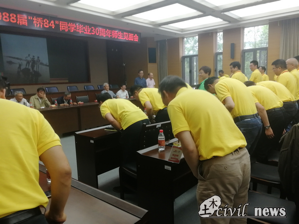下午2点,各位返校的校友身着统一的服装早早来到会议室就座,会场屏幕滚动播放着同学们当年的照片,伴随着勾人思绪的音乐,老师们陆续来到会议室。2点20分,见面会正式开始,在主持人在简短地开场后,全体校友起立,向面前的各位老师鞠躬。