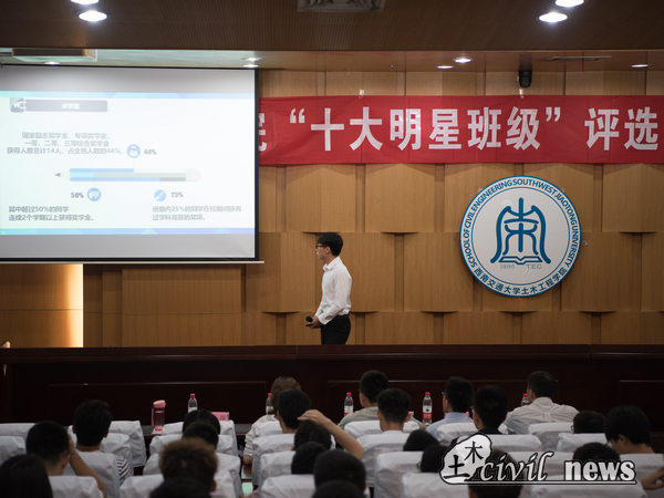 在接下来的答辩环节中,各位答辩手都向观众和评委们展示了各自班级的出彩与优秀。15级土木7班以2016-2017年挂科率为同级中最低、且大二第二学期挂科率为0出色表现傲视群雄,班长刘蝉杰用“勤奋乐学,进取拼搏。团结紧张,严肃活泼!”的班训精神诉说着7班故事。15级土木10班以顾天宇、初晓雷、孙浚杰为代表展现的竞赛之风,表现了十班人的强大与尚学精神,他们多次斩获国家级奖项,为土木学院更为西南交大争光扬名。