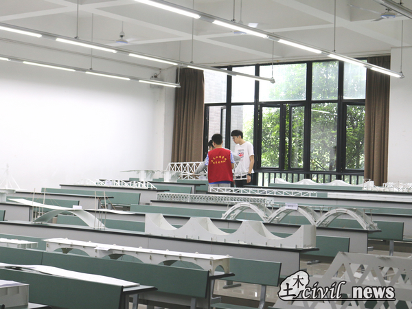 加载的过程紧张而又刺激,参赛选手从等候区到答辩区,找到自己的模型然后把它交给工作人员。调试过后,随着“三、二、一”的倒计时,工作人员放开托着砝码的手,选手的心也随之提到了嗓子眼。有些同学的模型经受住了砝码和承重小车的考验,在放上砝码和小车后安然无恙,加载成功。当然也有部分同学,可能是由于经验不足和考虑不够全面等原因,桥体在加载过程中出现了断裂和坍塌等现象,遗憾淘汰。