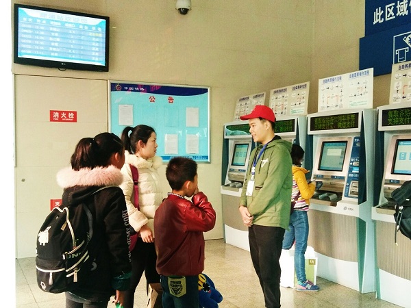 来到犀浦高铁站,首先要经过的地方便是售票厅。进入厅内,两抹红色便映入眼帘。“小伙子,这个火车票要怎么买啊?”一位满头白发的老奶奶问“小红帽”。“小红帽”则耐心地为老奶奶展示购票的流程。等到火车票拿在手里后,老奶奶乐得眼睛都眯成了一条线,“哈,谢谢啦!小伙子!”