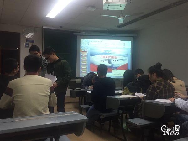 2017年11月12日,研究生2017级学硕道铁一班在逸夫楼4405a教室召开“学习党的十九大精神”党支部例会,班级全体成员参加该次例会,例会由该班班长张雯皓党支部书记谢清泉及宣传委员于杰共同主持。