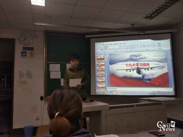 晚上7时,例会准时开始。该次例会的主题为“十九大会议内容学习与交流”。该班党支书首先就十九大主题报告概况进行总体陈述,就党在过去五年的工作历史性变革进行回顾。以知识问答的形式普及习近平新时代中国特色社会主义思想内涵,到场同学聚精会神地聆听并做好笔记。