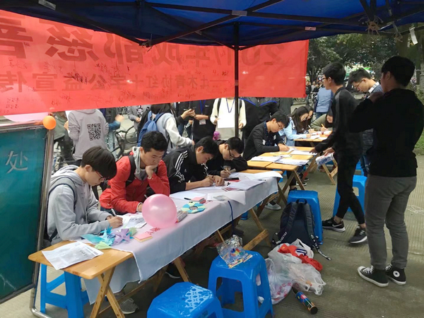 10月20日中午和下午,青协的小伙伴们在二食堂和四食堂门口向大家宣传成都慈善日。许多同学在这里写下了他们对希望中学快要参加中考的弟弟妹妹们的期望和祝愿,在宣传横幅上签下了自己的名字,践行了交大土木青协“趁年轻,行志愿”的誓言。