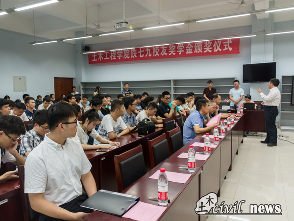 会议开始,向京华老师先做开场白,而后由李远富教授介绍莅临本次颁奖仪式的各位嘉宾。议程进行第二项,刘学毅教授致辞。刘教授首先回顾了交大人才辈出的历史和铁道专业的发展历程,随后向大家叙述了自己的经历,他还嘱咐所有在座同学,要“发扬土木铁道吃苦耐劳的精神”。议程第三项,奖学金捐赠代表——李远富教授先祝贺了获奖同学,接着回顾历史,他感慨道:“我们之所以有今天,就是得益于母校的培养。所以我们以设立奖学金的方式,来报答母校、回馈社会。”