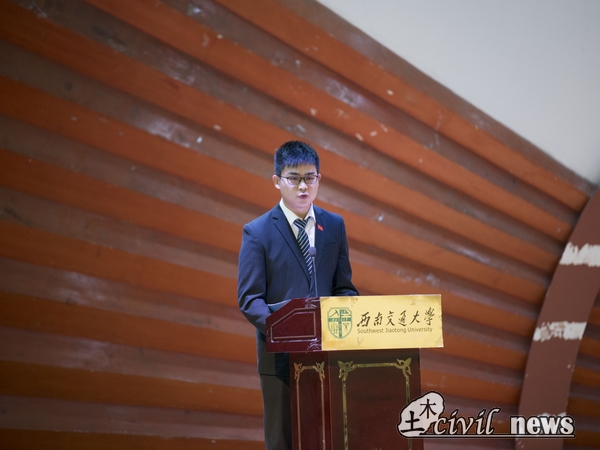 接下来大会进入第五项,由来自二班的新生代表孙振宇发言。他感慨道,无论是交大的历史成就还是如今如同“复兴号”列车这样的科研成果,无不令人感到自豪与骄傲,面对前辈的辉煌,我们土木学生更是要提升自己各方面的素养,为交大的明天而奋斗。