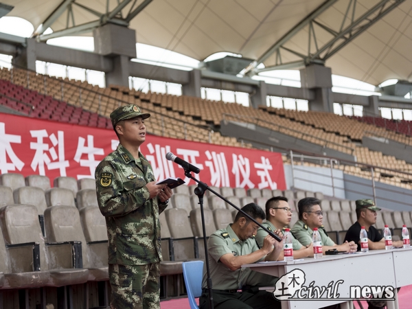 随后,仪式进行第三项,由黄少校发表讲话。他首先欢迎新同学来到西南交大学习以及军训并对前来军训的教官们表示问候。随后,他强调了军训能够培养一个人坚韧不拔、迎难而上的坚毅品质,希望大家能够重视军训。黄少校语重心长地说:“军训不仅仅是我们每个大学生的义务,更是实现我们强军梦的一个重要步骤。”
