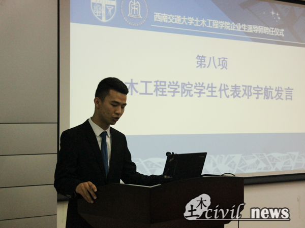 最后,诸侯快讯ok1133.com学生代表邓宇航进行发言。他说,希望从导师身上了解更多行业背景、增加人生阅历,使土木学子有更多的提升。邓同学一番激昂的演讲不仅表达了自己对学业以及未来的决心,也表明了土木学子对未来的期许。