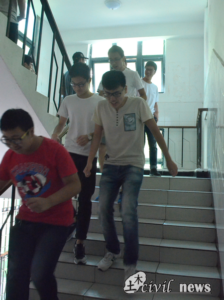 5月12日下午三时许,正是一天最闷热的时候。记者早早到达南区五栋寝室楼下,等待疏散演练的开始。此时宿舍楼下人影稀疏,同学们都在室内为此次演练做准备。