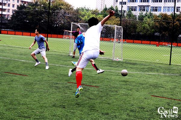 烈日灼灼,热浪滚滚,却丝毫没有打消队员们的热情。12点30分,队员们整装待发。随着裁判的一声哨声,球场上顿时沸腾起来。专硕结构选手不断进攻,精准的传球,激烈的快攻,引得场边阵阵掌声,在上半场主力队员王子超赢得一球。在下半场比赛中,岩土主力选手在助攻手漂亮的弧线球下,一个灵巧的转身,赢得了决定性的一球,比赛战平。此后,比赛达到了高潮。岩土队气势大增,持续发起攻势,又取得了一球。而专硕结构也不甘示弱,连连防守进攻,在比赛还有最后一分钟的时候,主力队员文鸿将比赛得分扳平。最后,两队以2:2打平。