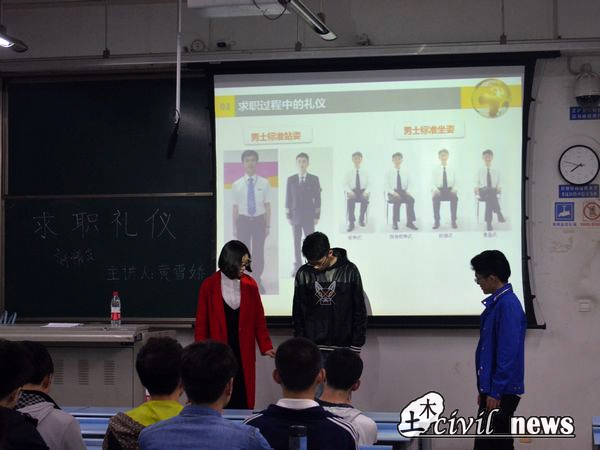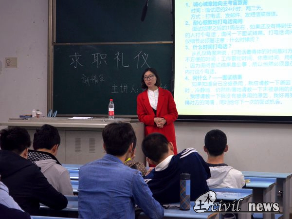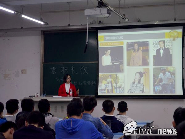4月11日晚,土木就业指导中心指导老师黄雪娇在X2524开展了一场求职礼仪讲座,该讲座面向即将面临职场竞争的2014级大三学子们。期间,黄雪娇老师以轻松幽默的语言向大三学子们讲述求职过程中的注意事项,吸引同学们细心倾听,让同学们获益匪浅。
