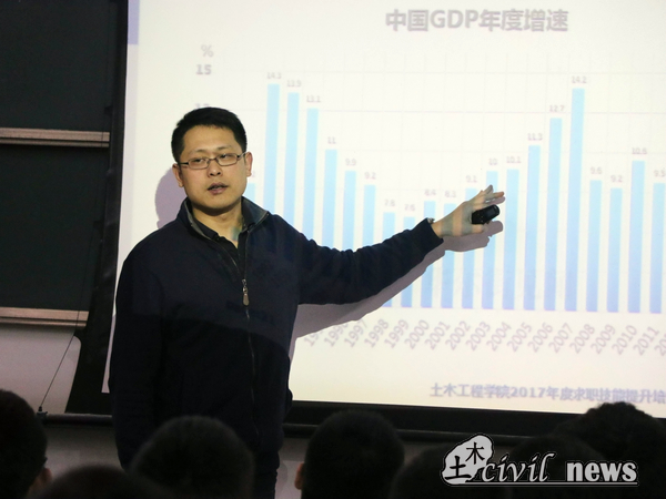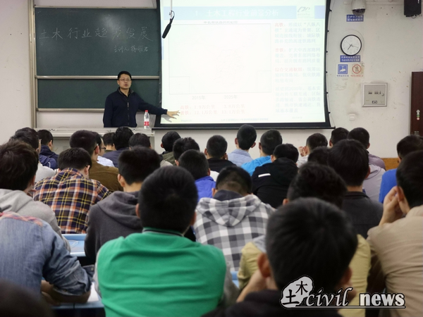 本次讲座共分为两个方面,其一是土木工程行业前景展望,其二是求职指导。在同学们的掌声中,蒋老师开始了他的讲座。
