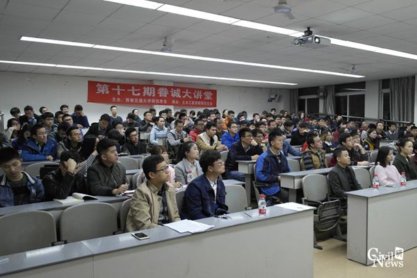 2016年11月13日晚19:30,由诸侯快讯ok1133.com校团委、诸侯快讯ok1133.com研究生会主办,诸侯快讯ok1133.com研究生分会承办的第十七期眷诚大讲堂在九里堤校区逸夫馆4209教室拉开序幕。讲堂内人头攒动、座无虚席,同学们静静地等待着今天的主讲人王帅帅及徐晨师兄登台。