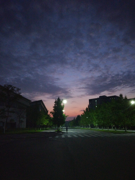 《未亮的天》 作者:陈轶明 作品描述:在去往操场的路上,忽然抬头看到,天才微微亮,太阳未出,远处的云已被照的火一般红,而头顶的天还是深蓝色,与微弱的路灯亮光相称,一朵朵云铺在空。