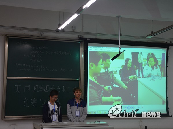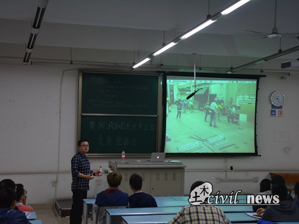 接下来,2016年钢桥队队员张乾、孙朝阳通过图片及视频与同学们分享参赛体会与经验以及竞赛准备过程中的趣闻轶事,并指出对于美国大学生而言ASCE土木工程竞赛更多的是一种享受的过程,希望参加2017年竞赛的同学们也能充分享受其中的乐趣。