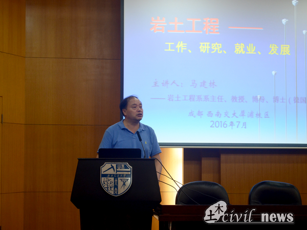 接下来,周晓军教授则以一种详尽严密的学科态度为大家带来地下系的解读。周教授的PPT主要从师资力量、专业课的设置、招生情况和保研工作条件等方面运用大量的数据以及实例进行分析。出现在屏幕上的数据宛如跳动的音符,让大家对于地下系有了更加深刻的理解。随后上台的铁道系和岩土系的老师也为各位在座的同学带来了本专业的详尽解读。结构工程的潘毅教授则通过一段十分钟简单而充实的介绍让大家对结构工程拥有了自己的理解,潘教授同时还对学生应选择有名还是有声的导师表达了自己的观点。