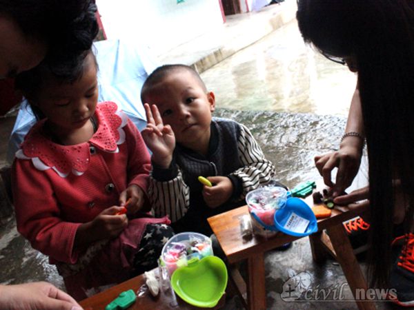 到达村里后,志愿者们赶往早已联系好的留守儿童吴明艳家里。志愿者们与两个小朋友进行了亲切的交谈,互相聊自己喜欢的动画片并且和孩子们玩起了游戏。就这样,志愿者们迅速与两个小朋友打成一片。